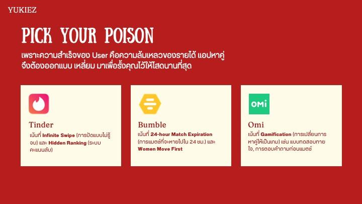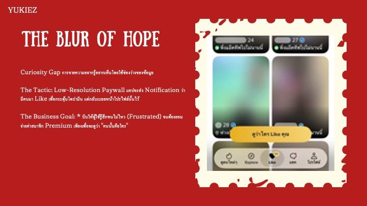 - Profit (The Dark Side): ยิ่ง User เจอคู่ช้าเท่าไหร่ เขาก็ยิ่งอยู่ในแอปนานขึ้น ยิ่งดูโฆษณามากขึ้น และมีโอกาสกดสมัคร Premium มากขึ้นเท่านั้น นี่คือที่มาของ Variable Reward System ที่ทำให้เราเสพติดการปัดเหมือนตู้สล็อต